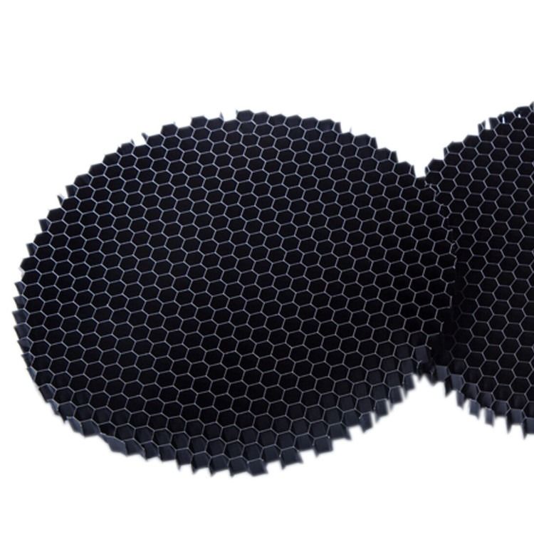 Aluminiowa kratka o strukturze plastra miodu jest wykonana z mikroporowatego aluminiowego rdzenia o strukturze plastra miodu, a długość boku rdzenia plastra miodu wynosi mniej niż 3 mm. Mikroporowaty aluminiowy rdzeń o strukturze plastra miodu jest wykonany z wielowarstwowej folii aluminiowej poprzez klejenie, prasowanie na gorąco, piłowanie i rozciąganie. Aluminiowa kratka o strukturze plastra miodu wykorzystuje mikroporowaty aluminiowy rdzeń o strukturze plastra miodu i jest malowana na czarno. Różne ramy mogą być dodawane zgodnie z wymaganiami klienta.